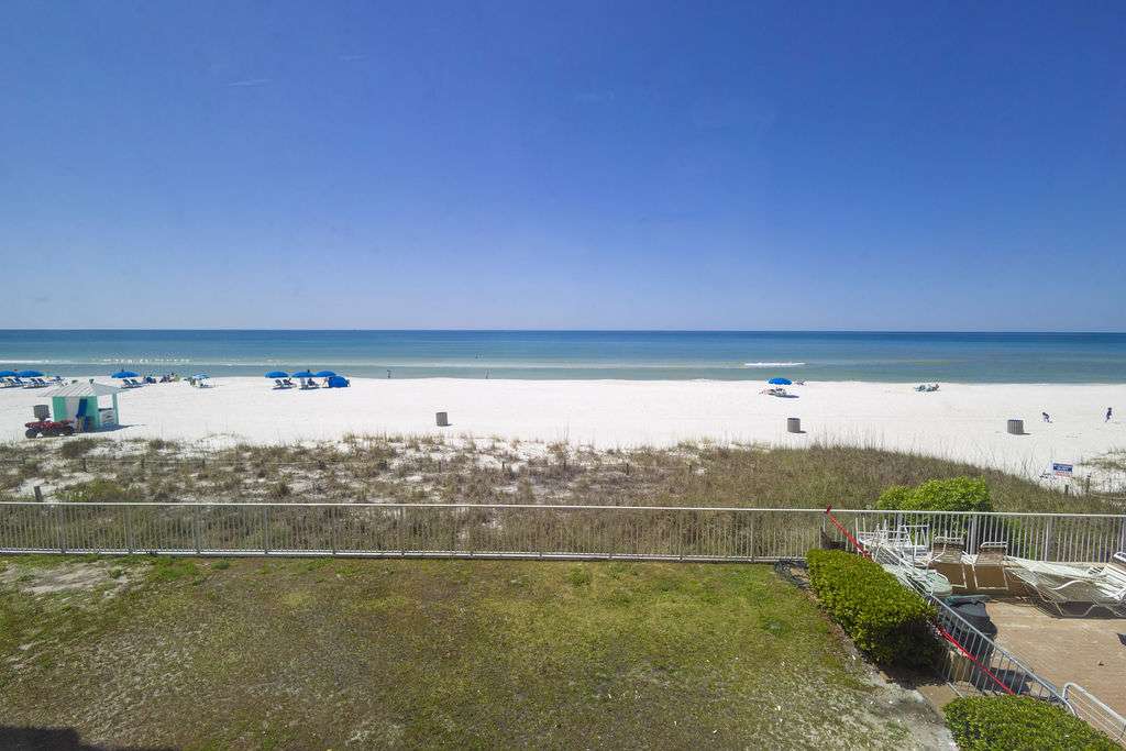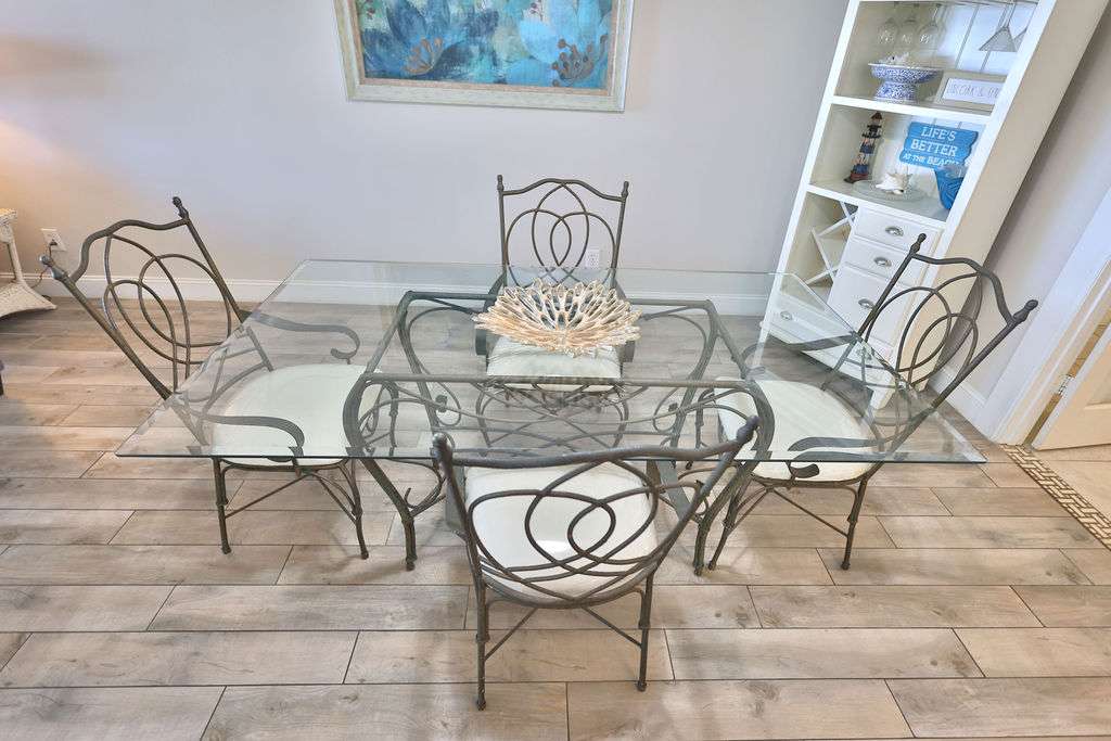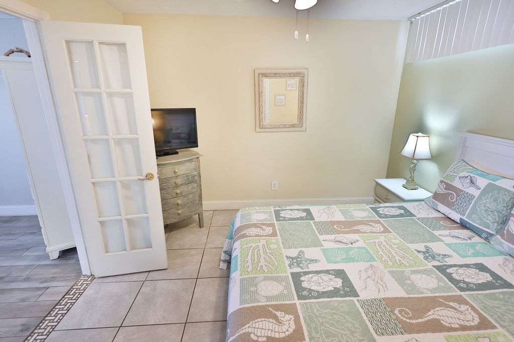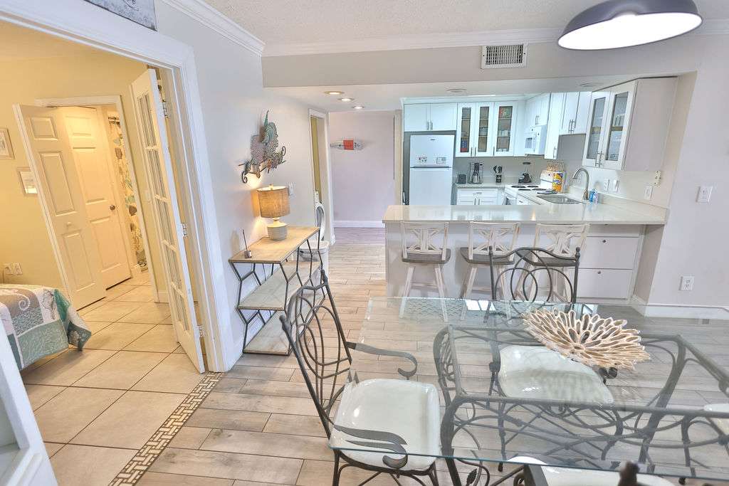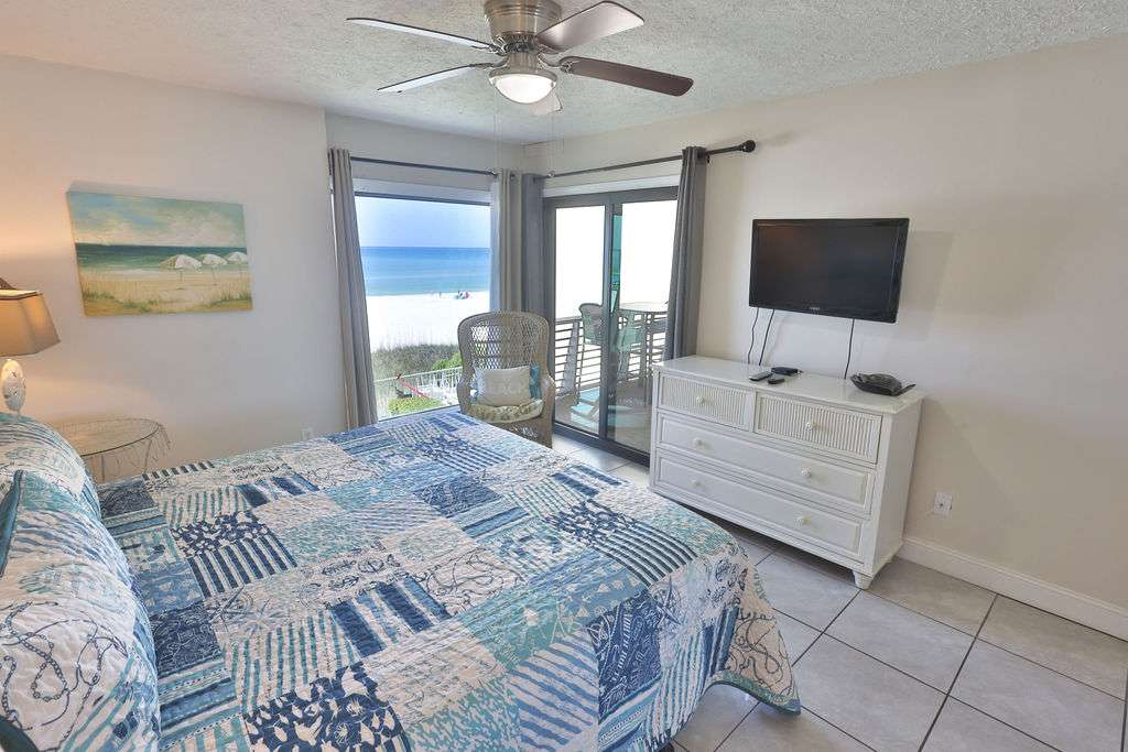Step into spacious coastal living in this beautifully appointed two-bedroom, two-bath condo. The master suite, featuring a sumptuous king-size bed, offers stunning views of the Gulf, ensuring every night ends with a touch of awe. The second bedroom, complete with a queen bed and its own full en-suite bathroom, shares a unique connection to the dining area through elegant French doors. When open, these doors merge indoor comfort with the refreshing seaside breeze, allowing you to gaze out over the patio towards the Gulf.