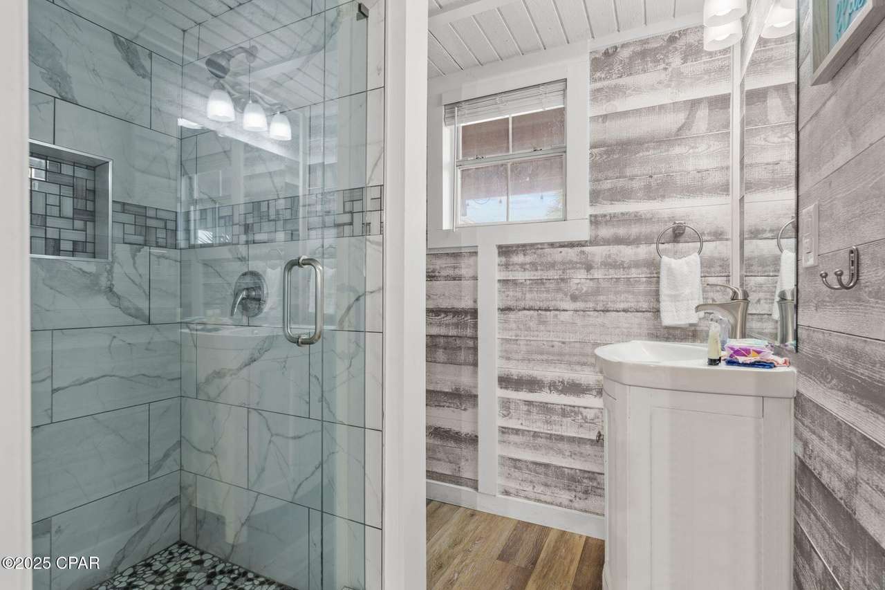 Bathroom features a walk-in shower, simple, clean, and beach ready Compact kitchen with essentials for light meals and morning coffee
